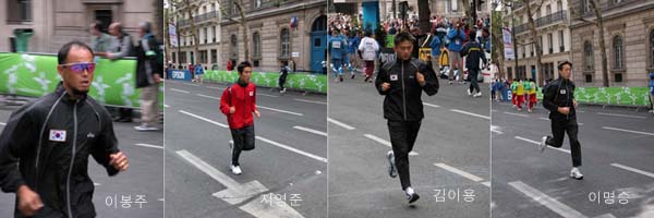8. 몸 풀기도 끝나고 경기 start. 중앙에 머리띠를 두른 이봉주선수가 보인다.